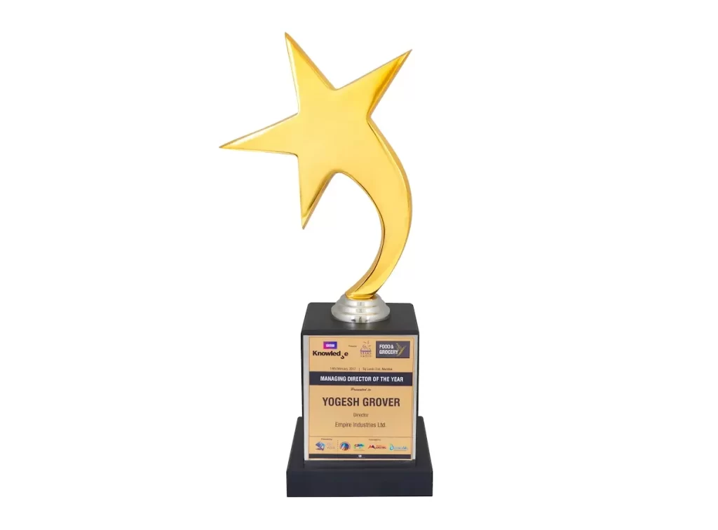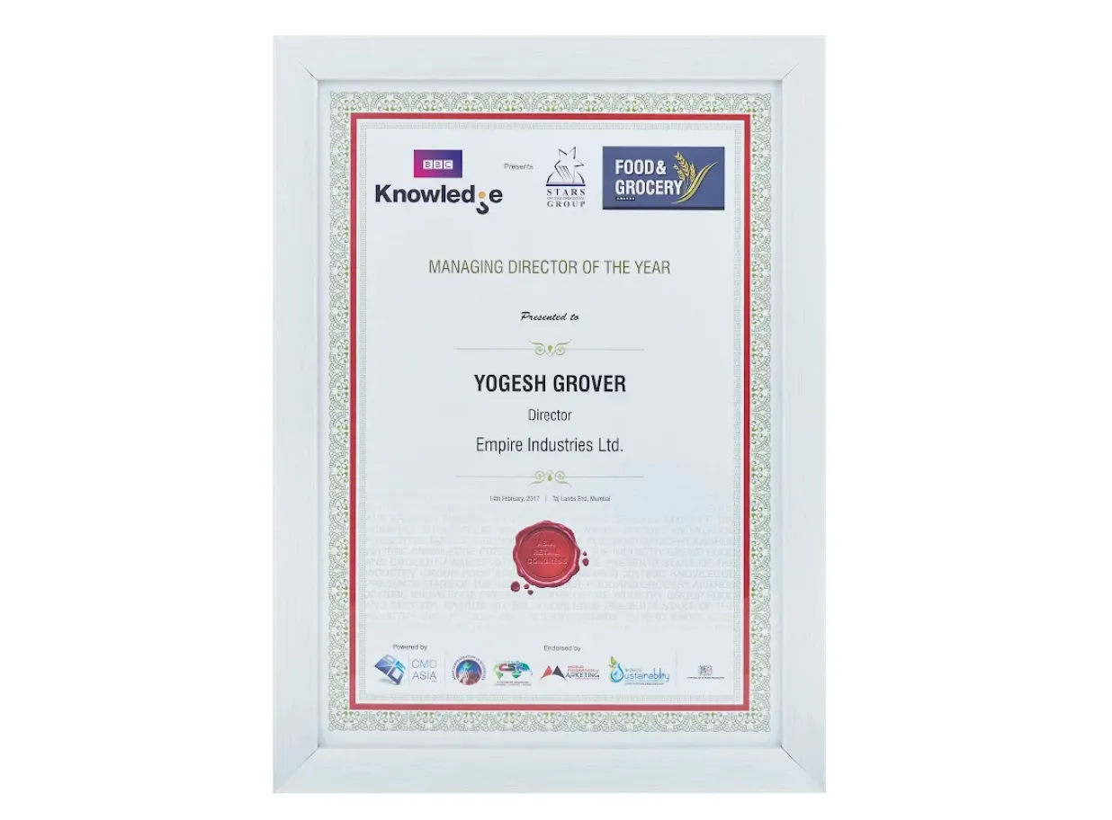 Mr. Yogesh Grover, Director of Empire Industries Ltd., was honored with the “Managing Director of the Year” award at the Food & Grocery Awards, presented by BBC Knowledge & Stars Group, in recognition of his outstanding leadership and contribution to the food and grocery industry.