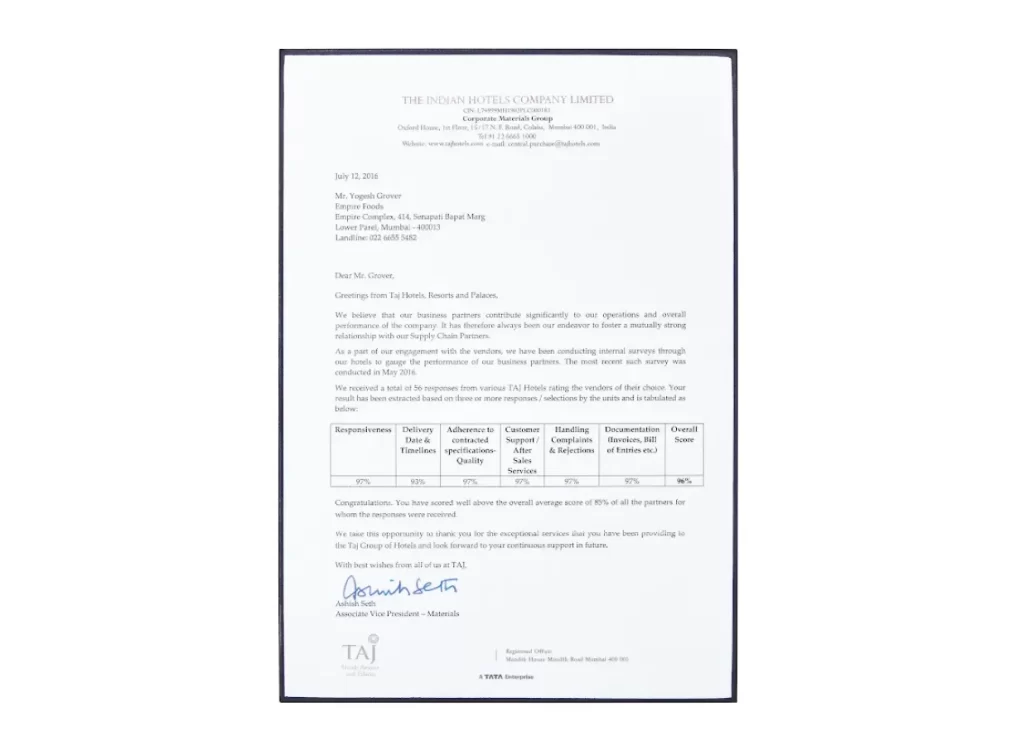 In an internal vendor evaluation conducted across Taj Hotels, Empire Foods achieved an overall performance score of 96%, significantly higher than the average vendor score of 85%.