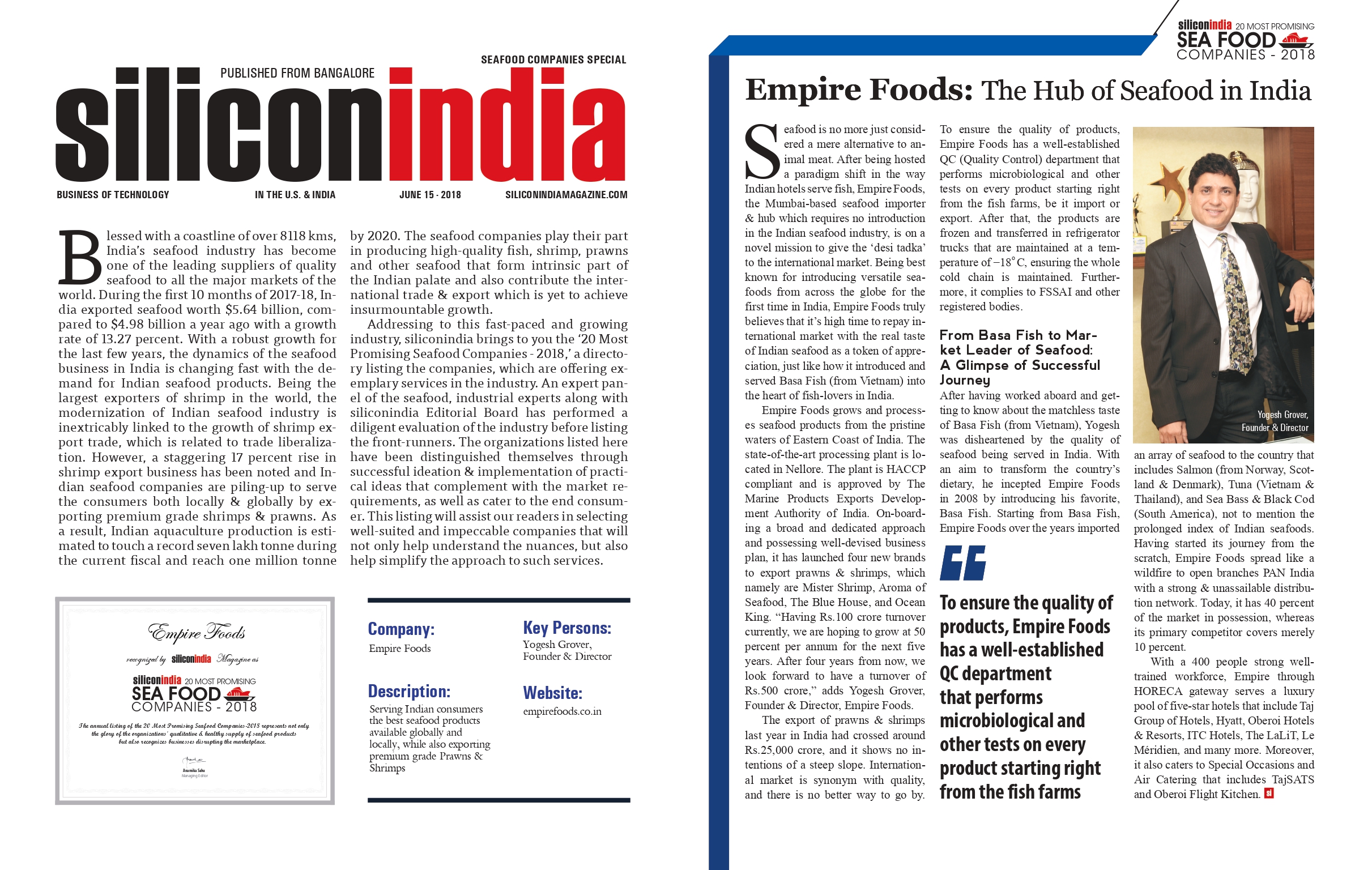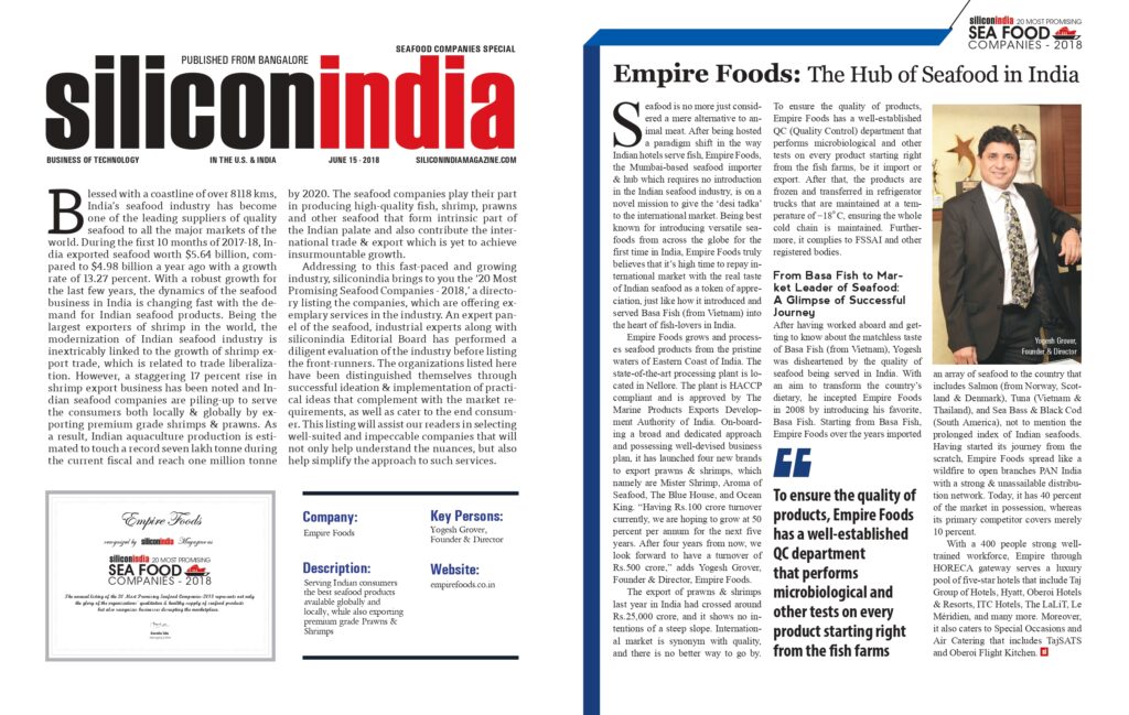 Empire Foods was proudly featured in the Seafood Companies Special edition by siliconindia, recognizing our contribution to the seafood industry and our commitment to delivering premium quality products.